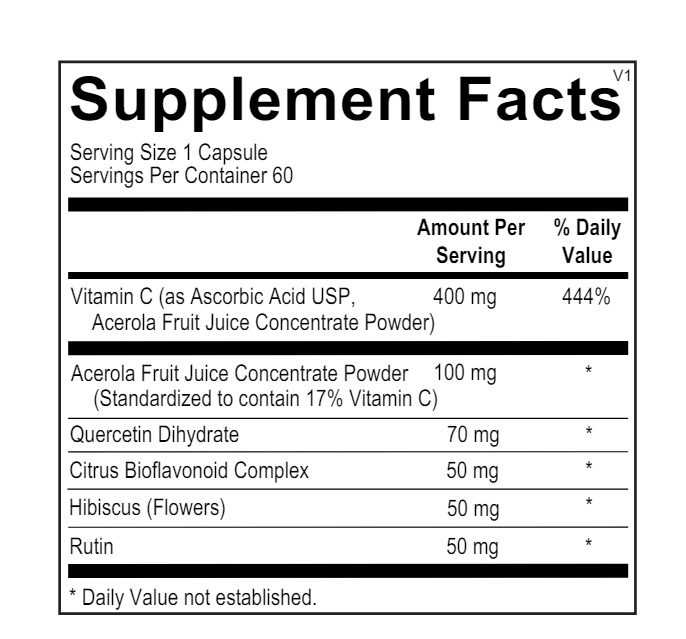 - Vitamin C (as Ascorbic Acid USP, Acerola Fruit Juice Concentrate Powder)