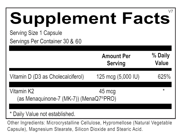 Usage Directions: Take 1 capsule of D3 with K2 (MK7) per day or as recommended by your healthcare professional.