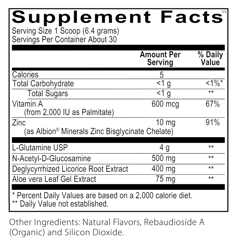 - Zinc (as Albion® Minerals Zinc Bisglycinate Chelate): Strengthens the GI barrier and supports the structure of tight junctions.