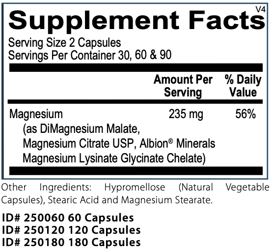 - Magnesium (as Di-Magnesium Malate, Magnesium Citrate USP, Albion® Minerals Magnesium Lysinate Glycinate Chelate): 235 mg (56% Daily Value)