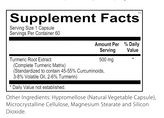 - Turmeric Root Extract (Complete Turmeric Matrix) (Standardized to contain 45-55% Curcuminoids, 3-8% Volatile Oil, 2-6% Turmerin): 500 mg *