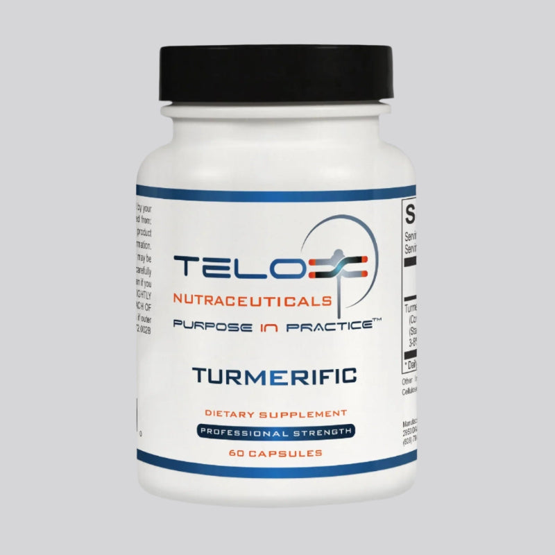 Turmerific by Telos Nutraceuticals is a comprehensive turmeric supplement formulated to maintain normal inflammatory balance, support microbiome diversity, provide potent antioxidant action, and enhance immune function. Turmerific contains the Complete Turmeric Matrix (CTM), an exclusive blend of bioactive phytonutrients including curcumin, turmerones, turmerin, curcumol, cyclocurcumin, curdione, and B-elemene, ensuring increased clinical efficacy and bioavailability.