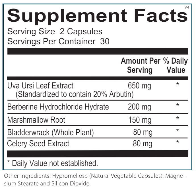 - Uva Ursi Leaf Extract (Standardized to contain 20% Arbutin): 650 mg